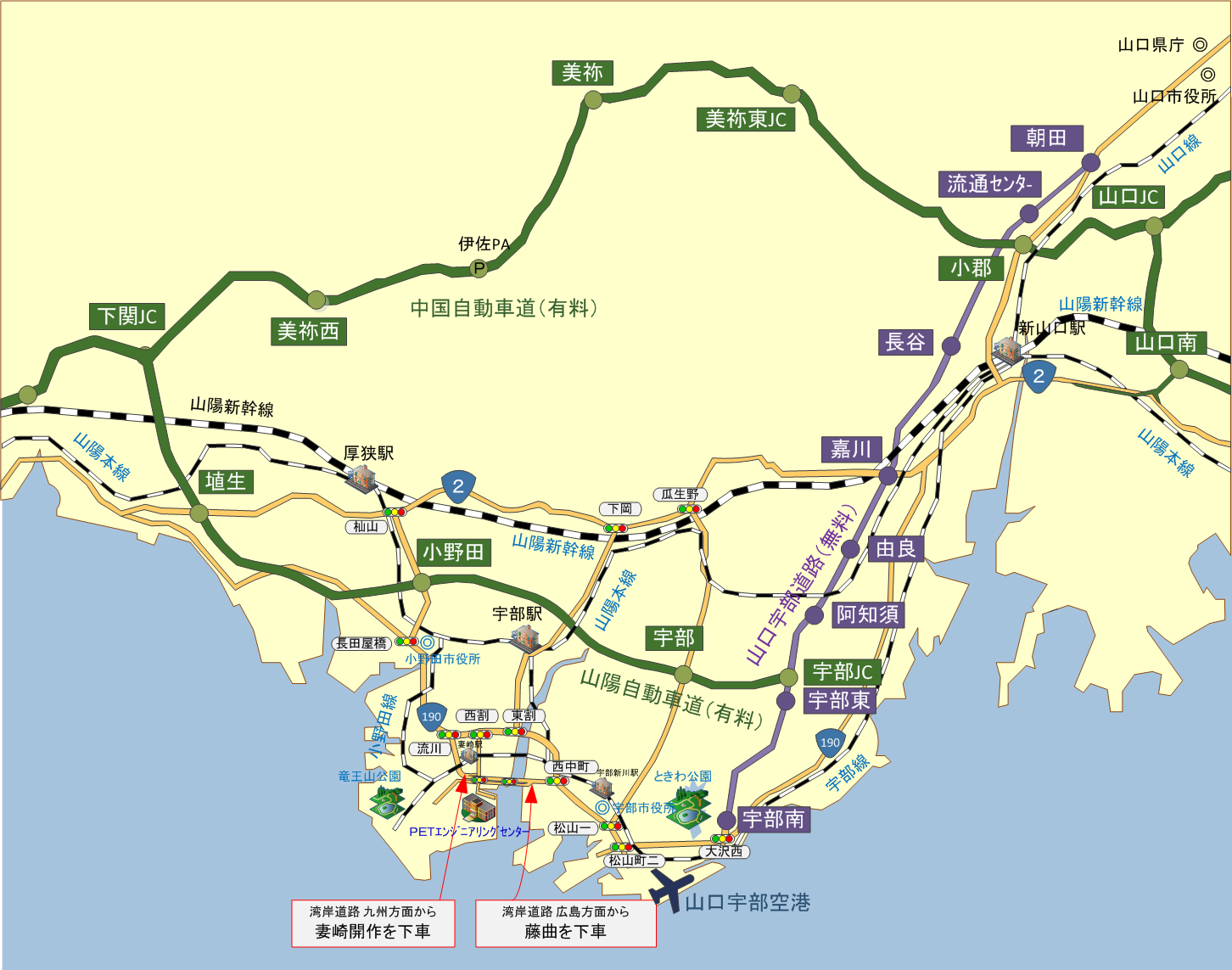 広島方面からお越しの場合 山陽自動車道宇部I.Cから約25分 九州方面からお越しの場合 山陽自動車道小野田I.Cから約20分 |