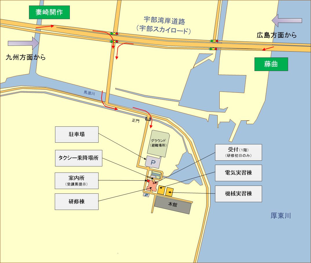 広島方面からお越しの場合 新幹線新山口駅→山陽本線宇部駅下車、宇部駅からタクシーで15分 九州方面からお越しの場合 新幹線厚狭駅→山陽本線宇部駅下車、宇部駅からタクシーで約15分 |