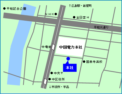 JR広島駅から路面電車宇品線、バス等で「中電前」下車し、徒歩2分 お車でご来社の方は近隣の有料駐車場をご利用ください |