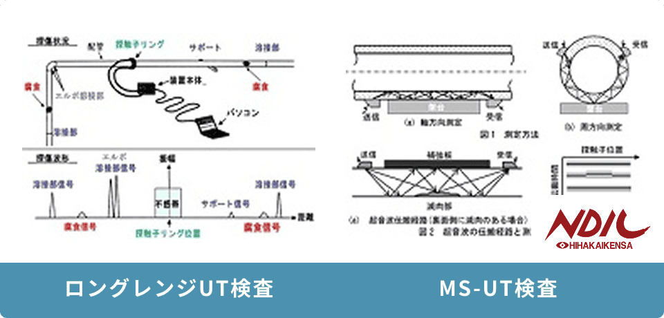 超音波のガイド波を適用した配管減肉の長距離スクリーニング検査(ロングレンジUT)や多数回反射技術の適用による測定が困難であった架台接触部の減肉検査 (MS-UT)も可能です。